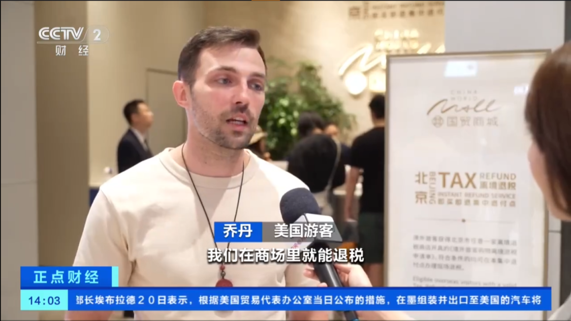 在北京购物的美国游客表示:我们在商场里就能退税,流程很快,也很简单,这样就不用跑到机场去办理了。